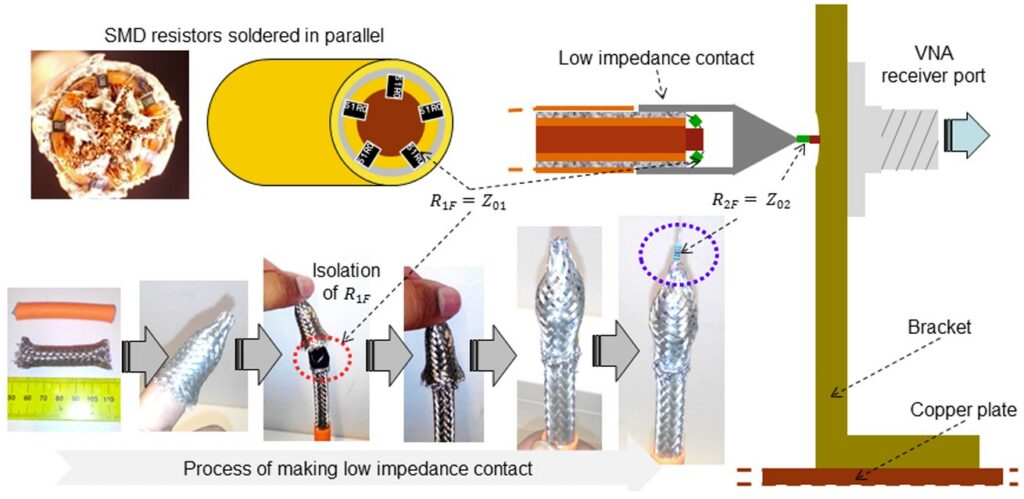 Figure 1. Ground Plate Method (GPM) test setup illustrating 360-degree shield braid termination and matched SMD star-configuration matching loads. (Image: Advances in Radio Sciences)