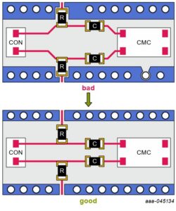 To manage these mismatches on the PCB, designers must maintain symmetry between the Connector (CON) and the Common Mode Choke (CMC). Figure 2 shows how such a symmetry can be achieved.