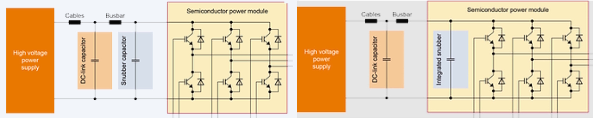 Employing a so-called hybrid architecture where the DC-link capacitance is split with a smaller capacitor placed directly adjacent to or inside the power module can be helpful (Figure 2). Another consideration is minimizing the contribution of the busbar inductance by using the shortest possible busbar.