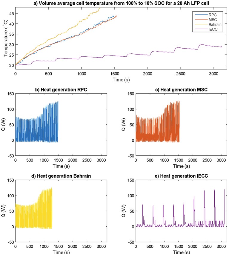 Figure 3 illustrates the thermal load under these conditions. In aggressive duty cycles (e.g., the Bahrain circuit simulation), average volumetric cell temperatures reach 47.5°C, generating 135 kW/m³ of heat. In contrast, standard IEC 62660-1 (IECC) testing profiles reach only 30.0°C and 30 kW/m³.